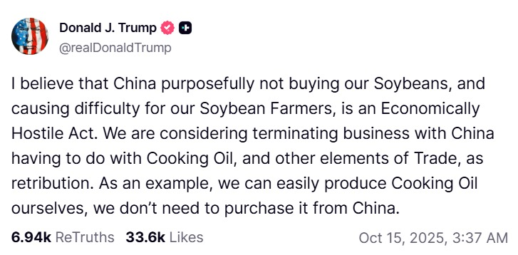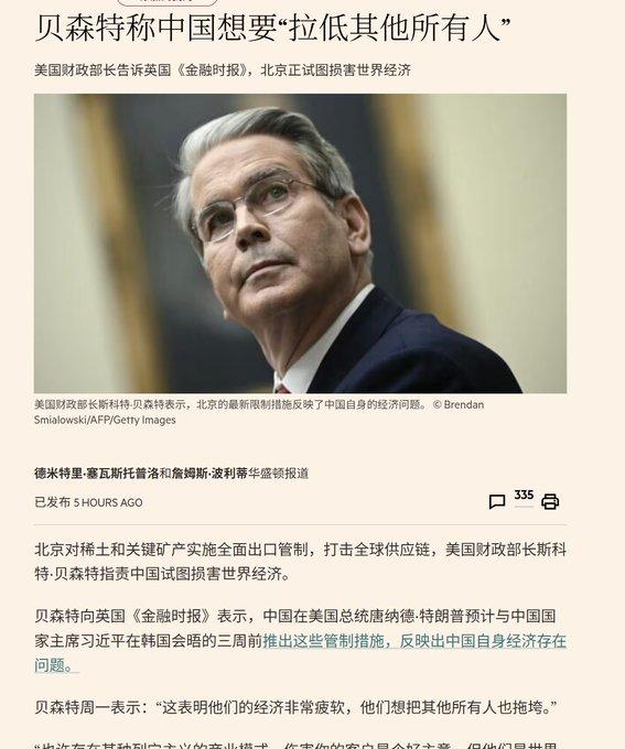 美国财长贝森特接受《金融时报》采访时表示,中国对稀土和关键矿物实施了全面的出口管制,“这表明他们的经济非常疲软,他们想把其他所有人都拖下水”他讽刺说“中国似乎在奉行一种‘列宁式商业模式’,以伤害客户为手段”。但他们是全球最大的供应者。若他们想让全球经济放缓,受伤最深的会是他们自己。”