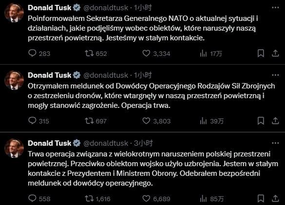 同日,图斯克在X平台连发三文,指责俄罗斯无人机“多次侵犯波兰领空”。他说:“我已向北约秘书长吕特汇报了当前局势以及我们针对侵犯我国领空的物体所采取的行动。我们一直保持着密切联系。”