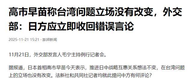因此,在沉默了足足14天后,高市早苗终于再次作出了涉台表态,完全没有上一次的强硬态度,而是宣称“日本对台湾问题的立场没有变”,并强调她要继续推动日中战略互惠关系。很明显,高市早苗希望中方能网开一面,让中日这一轮的风波就这么过去。但她的这个请求,中方肯定不会答应。因为风波持续了半个月,高市早苗和日本政府依然不撤回错误言论,也不认错道歉,完全没有解决问题的诚意。在11月21日,中国外交部发言人毛宁在回应高市的涉台表态时,明确表示日方应立刻撤回错误言论,用实际行动落实对华一系列承诺。中方这番斩钉截铁地回应,直接把话给高市讲明白:你自己惹出的事,就必须自己解决,别想轻描淡写混过去!